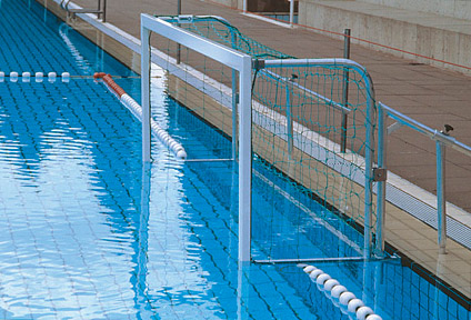 Ворота для ватерполо стаканного типа используются в бассейнах, глубина которых менее 150 см, а также в бассейнах, ограниченных в свободном пространстве для размещения игрового поля. Особенность конструкции позволяет изготавливать систему крепления под заказ, учитывая конкретные размеры чаши бассейна. Произведены в соответствии с правилами FINA и подходят для проведения официальных соревнований. Размер 300х90 см. Стойки ворот и перекладина изготовлены из прямоугольного профиля 80x40 мм и окрашены в белый цвет. Каркас изготовлен из алюминия. В комплекте поставки ворота (2 шт.) без сеток и без анкерных стаканов.
